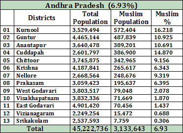 The following tables show the population of Muslim in each district of all the states, according to the census of 2001.